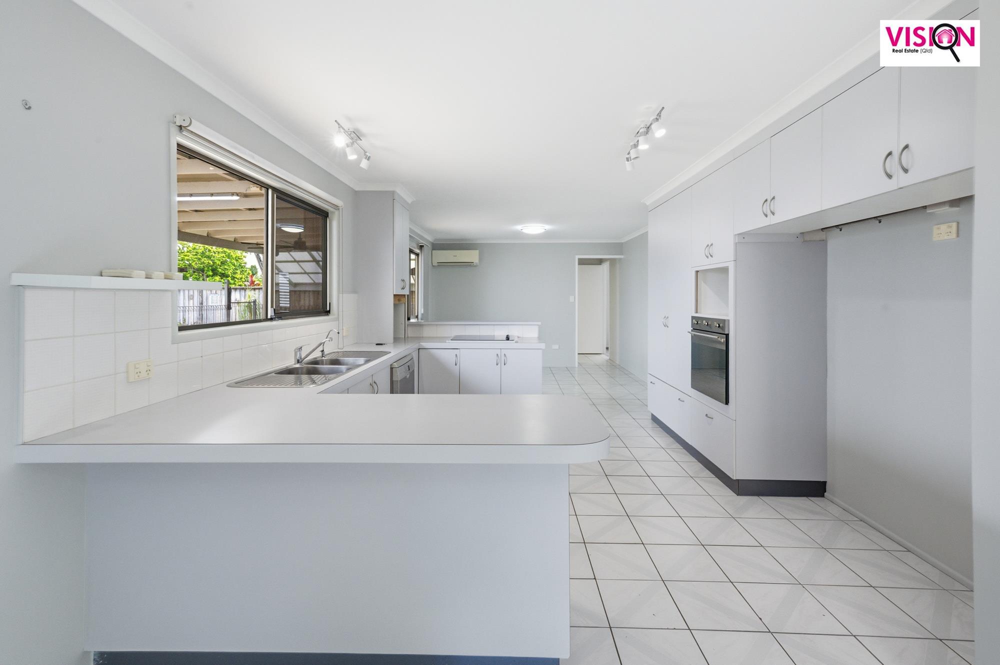 • Large tiled kitchen with dishwasher, dual fridge space and ample cupboards plus pantry