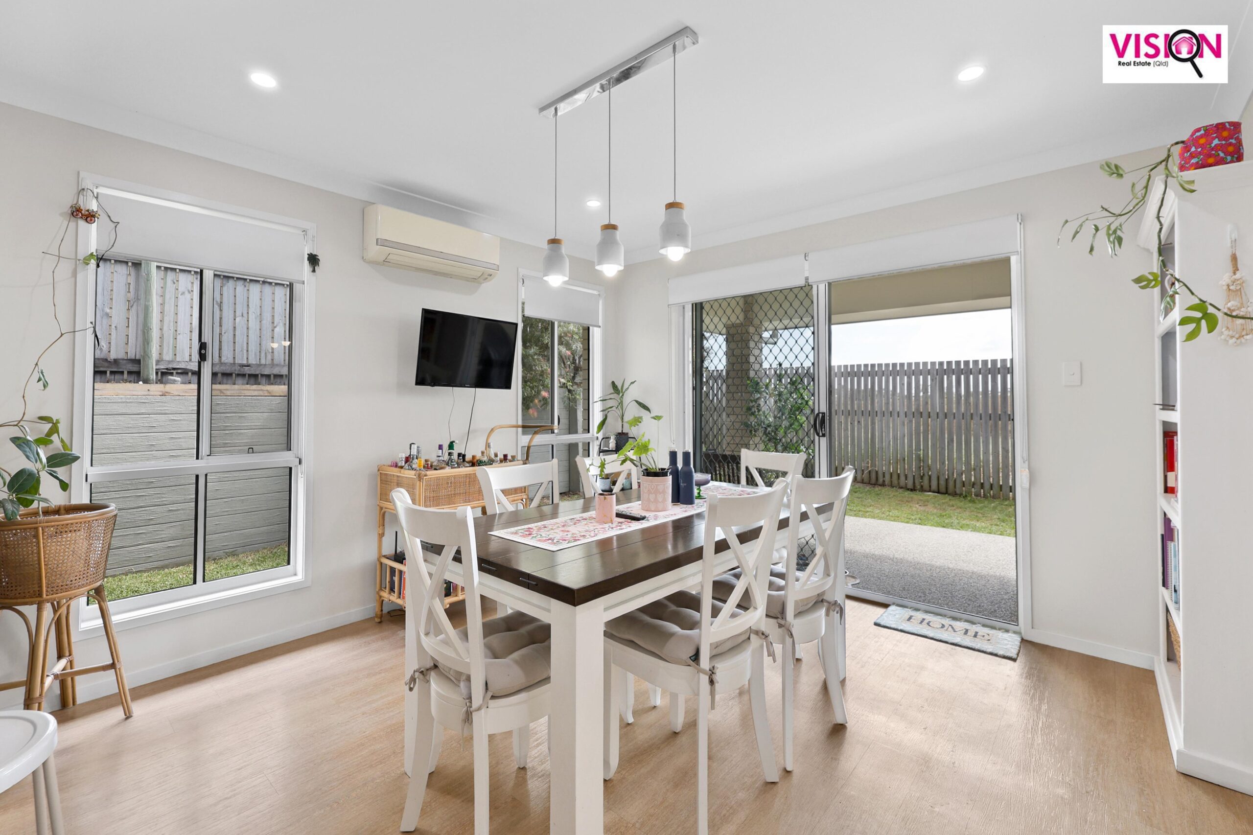 Open-plan living & dining, flowing out to the outdoor patio via sliding security doors